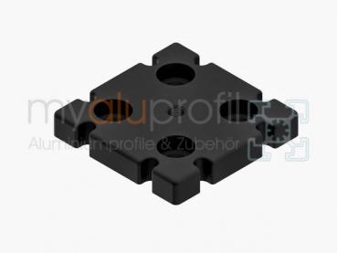 Stabile Befestigungsplatte zur Aufnahme von Stellfüßen und Rollen.Die Fussplatte kann stirnseitig in die Kernbohrungen der Profile verschraubt werden. Zur Befestigung werden vier Zentralschrauben M12x30 benötigt. Verbaubar nur mit Profil 10 90x90 leicht