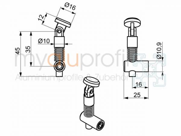 Gelenkkopf-Schnellspanner werden für eine 45°-Verbindung eingesetzt. In einem Profil muß eine Bohrung mit dem Durchmesser 11mm mit 40mm von der äusseren Kante eingebracht werden. Durch Anziehen der Madenschraube des im Profil befindlichen Gehäuses wird eine Spannung erzeugt.